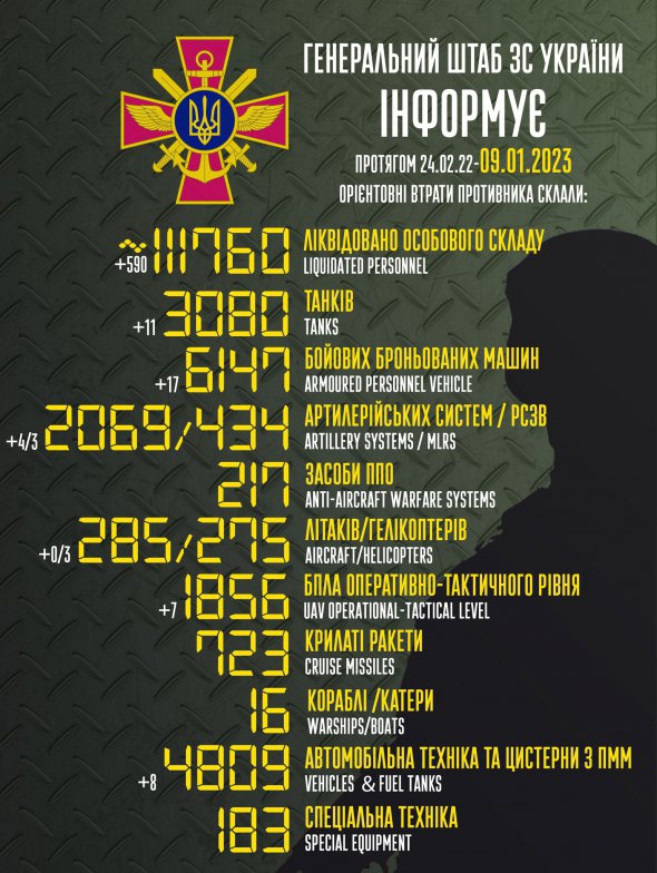 Загальні бойові втрати Росії на ранок 9 січня становлять понад 111 760 осіб.