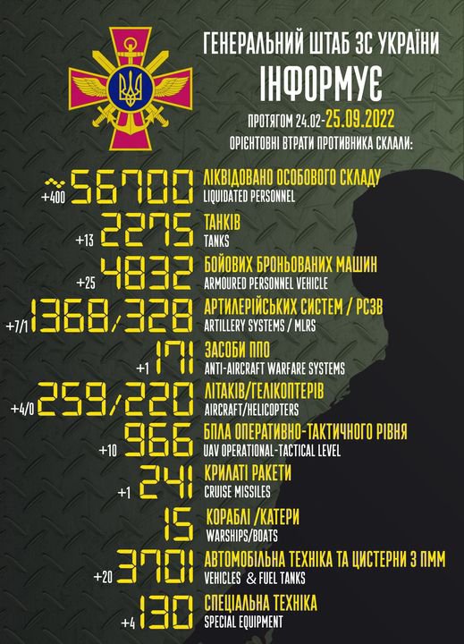 Загальні бойові втрати росіян на ранок 25 вересня становлять 56,7 тис. осіб.