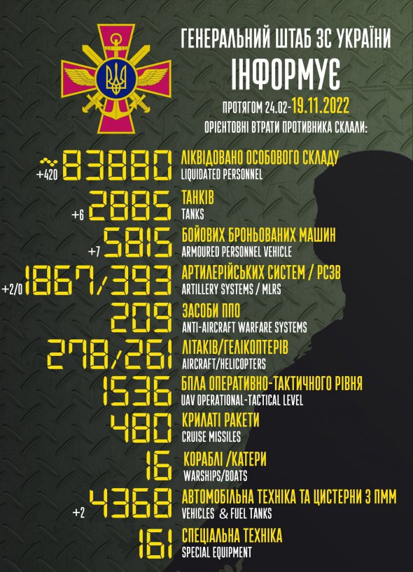 Загальні бойові втрати Росії на ранок 19 листопада становлять 83 880 осіб.