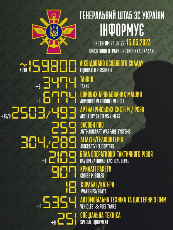 Загальні бойові втрати Росії на ранок понеділка, 13 березня, становлять 159,8 тис. окупантів.