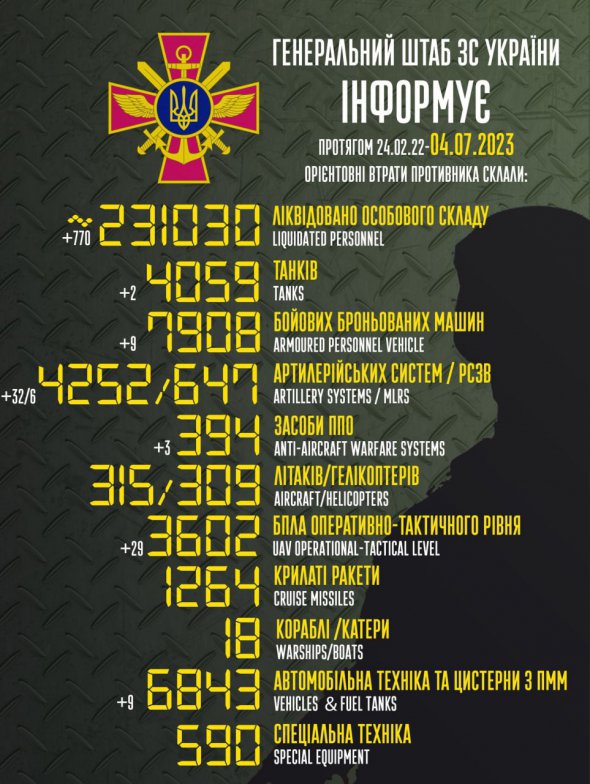 Загальні бойові втрати Росії на ранок 4 липня становлять уже понад 231 030 окупантів.