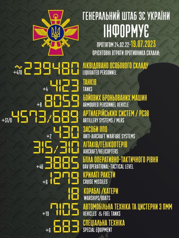 Загальні бойові втрати Росії на ранок 19 липня становлять уже понад 239 480 окупантів.