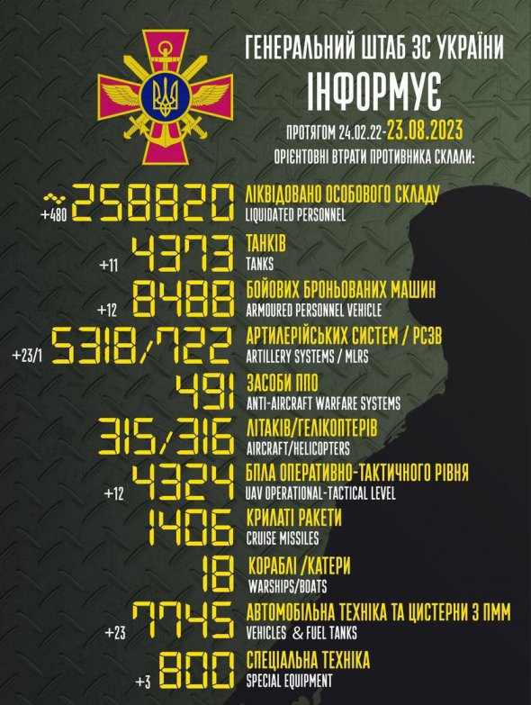 Загальні бойові втрати Росії на ранок 23 серпня становлять уже понад 258 820 окупантів.