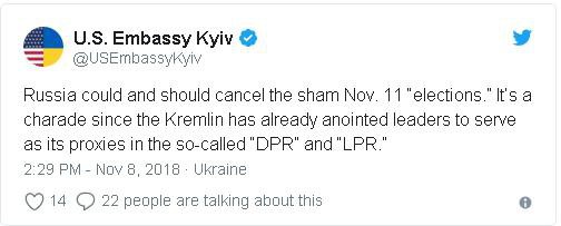 "Росія може та повинна скасувати бутафорські "вибори" 11 листопада. Це фарс, оскільки Кремль вже помазав ватажків, які служитимуть йому як власні ставленики у так званих ДНР і ЛНР", - йдеться на офіційній сторінці посольства у Twitter.