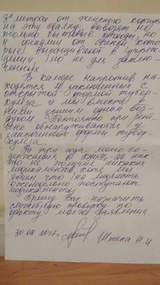 "24 червня 2017 року офіцер ХУІНа мене побив. Керівництво, щоб уникнути конфлікту, відразу ж перевело Щербина в іншу установу - 18 колонію", - написала лист міністру юстиції Штепа.
