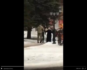 На відео два чоловіка у військовій формі та жінка одягнута в довгу шубу штовхаються біля машини.