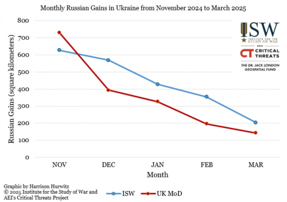Із листопада 2024 року швидкість російського просування в Україні зменшується щомісяця. Якщо в листопаді російські війська захопили приблизно 730 км² території, то вже в грудні - 393 км², у січні 2025 року - 326 км², у лютому - 195 км², а в березні - лише 143 км².