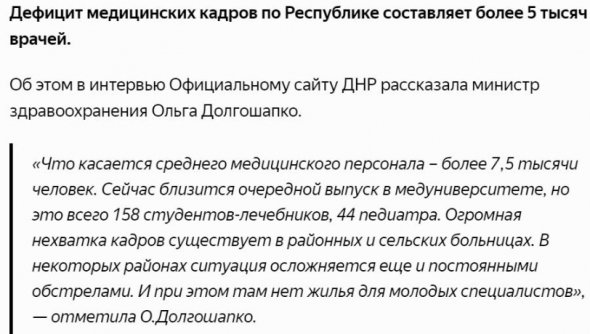 Відзначається, що в ДНР немає ні персоналу, ні житла для молодих кадрів. До того ж, "ситуація ускладнюється постійними обстрілами".