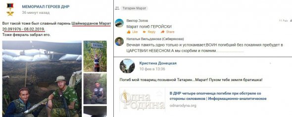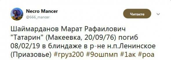 "Шаймарданов Марат Рафаїлович "Татарин" (Макіївка, 20 вересня 1976 року). Загинув 8 лютого 2019 року в бліндажі в районі населеного пункту Ленінське (Приазов'я)", - написав він.