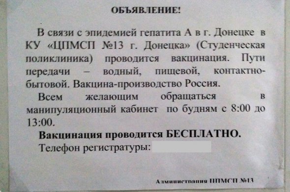 "У зв'язку з епідемією гепатиту А в м. Донецьку в КУ "ЦПМСП №13 м. Донецька" (Студентська поліклініка) проводиться вакцинація. Шляхи передачі - водний, харчовий, контактно-побутовий. Вакцина - виробництво Росія. Всім бажаючим звертатися в маніпуляційний кабінет по буднях із 8:00 до 13:00. Вакцинація проводиться безкоштовно", - написано в оголошенні.