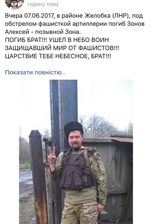 Наприклад, терорист ЛНР Олексій Зонов на позивний Зона. Приїхав з Єкатеринбурга, щоб "захищати русский мир" на Донбасі, де і залишився. Зона загинув під час боїв за Жолобок. За словами поки ще живих терористів, через постріл української артилерії.