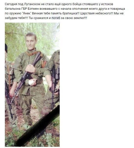 Ще одним загиблим під Луганськом терористом став боєць на позивний Янек. Як пишуть бойовики в мережі, їхній колега стояв біля витоків угруповання "Бетмен", що виникло на Донбасі у перші дні війни.