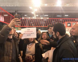 "Це обурило найбільше - до Франції, де проходить найзначніший салон книги в Європі, приїхав вбивця, людина, яка всім розповідає, як він формував загони вбивць, які приїжджають в Україну. І сьогодні Росія, яка є почесним гостем салону, вона представляє вбивцю і книги вбивці на своєму стенді. Це нас дуже зачепило, тому ми прийшли і представили свою позицію", - пояснила агентству ще одна представниця української громади, яка брала участь у протесті.
