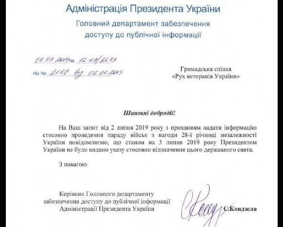 "Параду наших військ на День Незалежності не буде. Цьогоріч", - прокоментував він та опублікував відповідь Адміністрації президента на запит від Спілки ветеранів АТО.