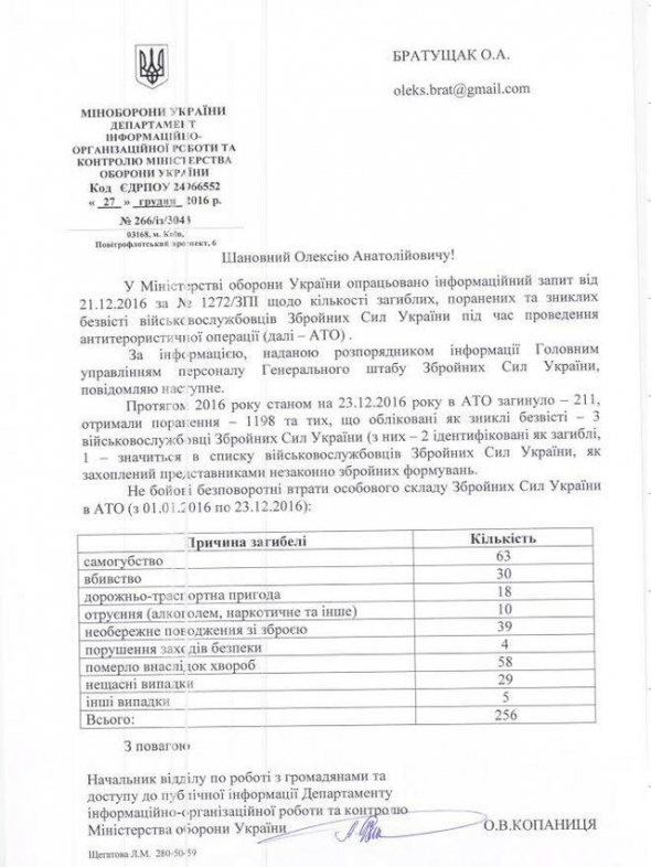 У 2016 році небойові втрати в зоні проведення антитерористичної операції в української армії становлять 256 осіб.