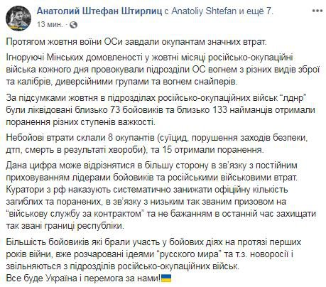 "Небойові втрати склали 8 окупантів (суїцид, порушення заходів безпеки, ДТП, смерть через хвороби) і 15 отримали поранення. Цифра може відрізнятися в більшу сторону в зв'язку з постійним приховуванням лідерами бойовиків і російськими військовими втрат", – написав "Штірліц".