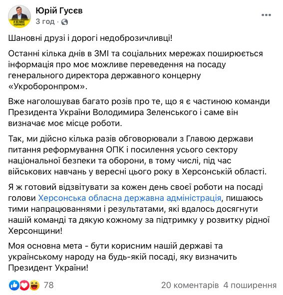 "Моя основна мета - бути корисним нашій країні й українському народові на будь-якій посаді, яку визначить президент України" - написав Гусєв.