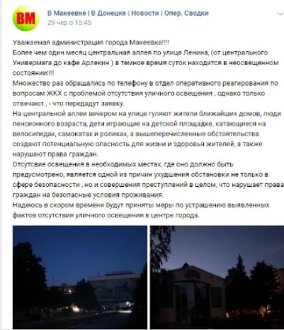 "Безліч раз зверталися до відділу оперативного реагування з питань житлово-комунального господарства з проблемою відсутності вуличного освітлення, однак там лише відповідають, що передадуть заявку", – написала Катерина Черненко в спільноті "У Макіївці". Додала, що в темряві люди не тільки ризикують отримати травми, а й стати жертвами злочинців.