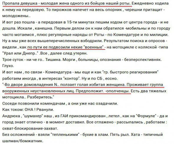 Він зазначив, що жінка зникла, коли пішла до чоловіка на передову. За 3 дні найманцям повідомили, що її забрала група військових, а потім стало відомо, що в одному з притулків угруповання бойовиків бачили побиту жінку.