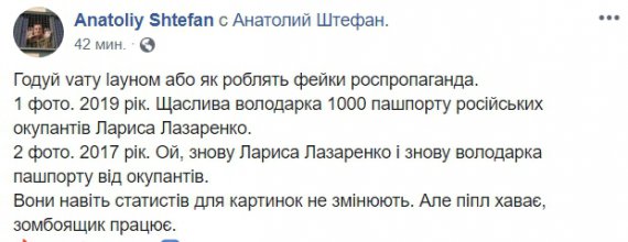 "1-е фото. 2019 рік. Щаслива власниця 1000-го паспорту російських окупантів Лариса Лазаренко. 2-е фото. 2017 рік. Ой, знову Лариса Лазаренко і знову володарка паспорту від окупантів. Вони навіть статистів для картинок не змінюють. Але піпл хаває, зомбоящик працює", - зазначив Штефан.