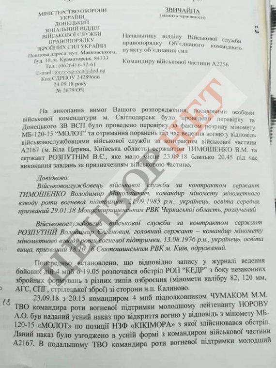 У документах значиться, що використовуваний під час виконання бойового завдання з ведення адекватного відповідного вогню міномет М120-15 "Молот" був справним.