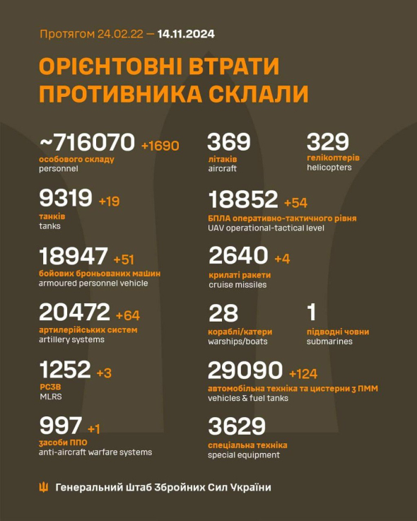 Загальні бойові втрати російських окупантів на ранок 14 листопада склали 716 070 осіб.