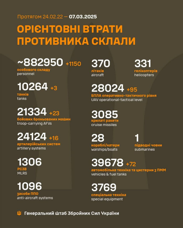 Сили оборони продовжують завдавати втрат країні-агресорці Росії. 7 березня вони сягнули 882 950 вбитими і пораненими.