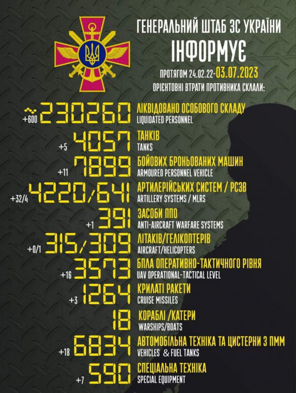 Загальні бойові втрати Росії на ранок 3 липня становлять уже понад 230 260 окупантів.