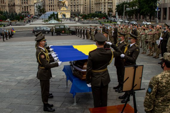 Майданом несуть тіло загиблого Героя України, лейтенанта Тараса Матвіїва. 31-річний офіцер загинув 10 липня, рятуючи під час обстрілу побратимів.