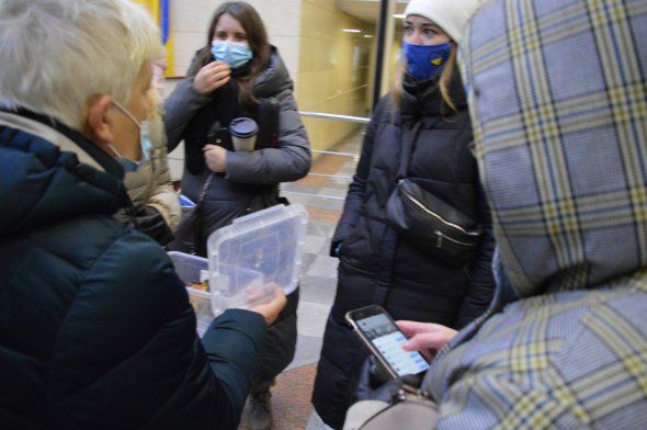 По залі розносять домашні страви. Жінка у синій куртці тримає в руках "судочок".