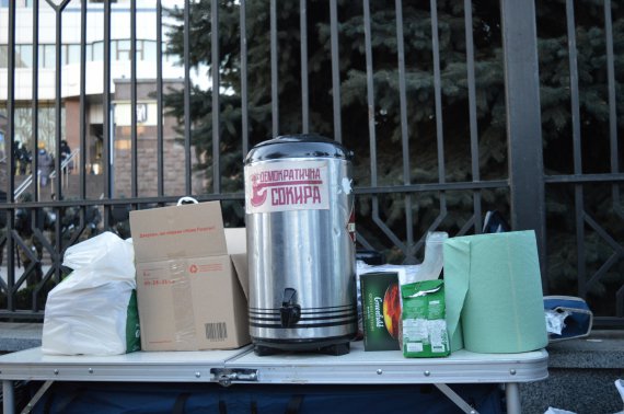Для підйому настрою під будівлю принесли колонку та включили патріотичну музику. Щоб люди не змерзли хтось з Демсокири привіз канапки, гарячу воду, чай та каву. Поліцейських та Нацгвардійців не пригощають.