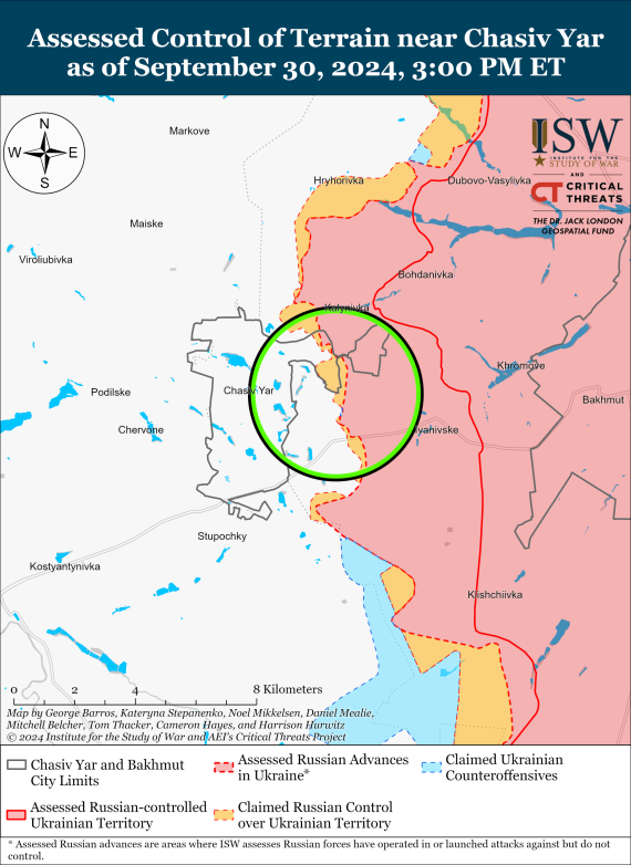 Аналітики зазначають, що війська РФ просунулася на північний схід від Часового Яру. Геолокаційні кадри за 30 вересня свідчать про просування на північний захід вздовж траси E40 Бахмут-Слов'янськ поблизу Залізнянського. За даними українських та російських джерел, 29-30 вересня тривали бої на східній околиці Часового Яру та поблизу Білої Гори.