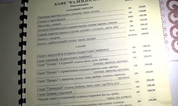 В меню можна побачити салат "Русский", який складається з капусти, кукурудзи, курячого філе, сиру, огірка. За 100 г треба віддати 150 грн, при зарплаті в 4170 грн.