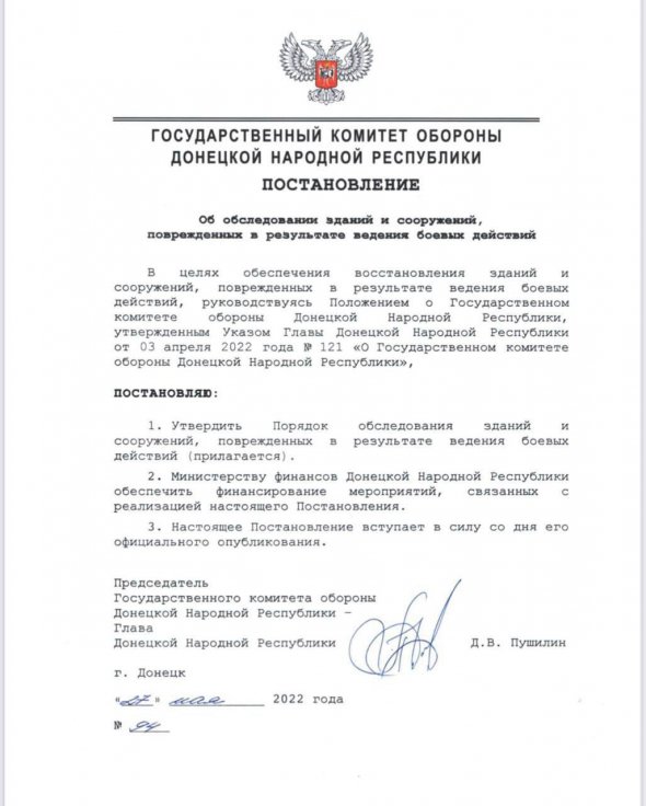 Окупаційна влада Донецької області почала оцінювати рівень пошкоджень на підставі нещодавного прийнятого рішення ватажком Пушиліним.