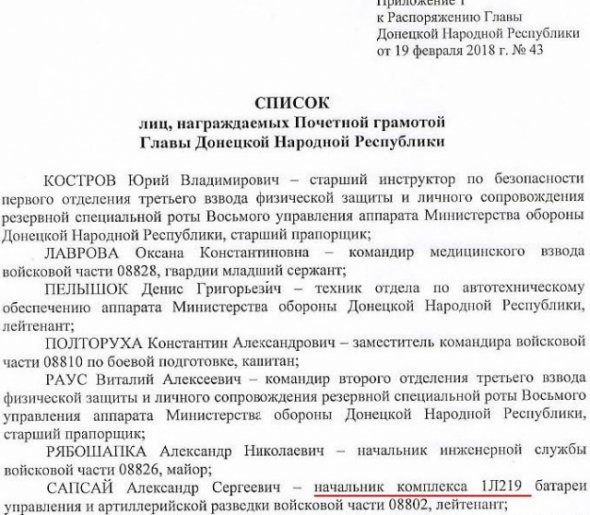 Наявність зброї Захарченко "спалив" через "розпорядження" про нагородження низки осіб почесними грамотами. Зазначається, що у додатку, опублікованому на "офіційному" сайті ДНР, є лейтенант Олександр Сапасай, який командує комплексом 1Л219М.