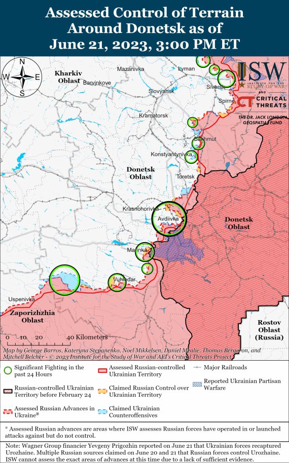 Водночас окупанти вели безуспішні наступальні дії в напрямку Діброви, Серебрянки та на лінії Кремінь – Ямполівка. Геолокаційні кадри від 20 червня свідчать, що українські воїни відбили наступ бронетехніки РФ на схід від Спірного.