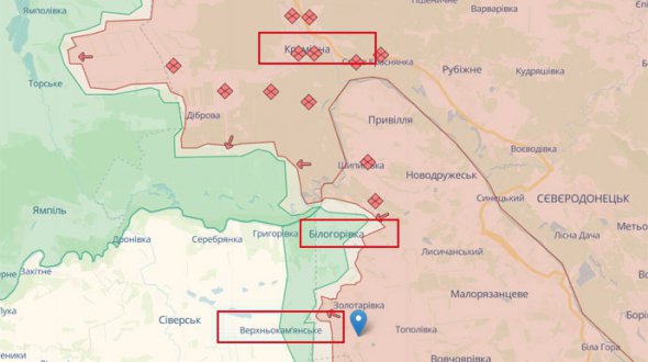 "Геолокаційні кадри, розміщені 24 квітня, показують, що українські сили домоглися незначних успіхів на північний схід від Верхньокам'янського (18 км на південь від Кремінної) і на південний схід від Білогорівки (12 км на південь від Кремінної) у невстановлені дати", – зазначили аналітики.