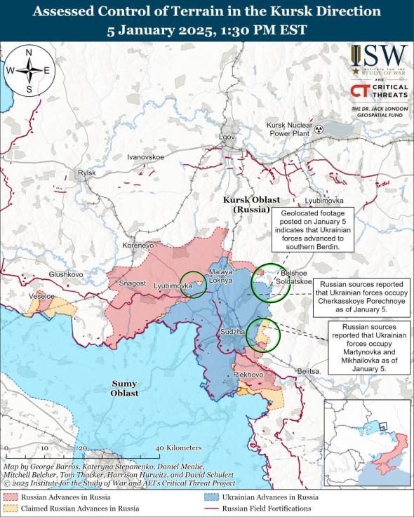 Російські воєнкори тим часом опублікували оновлені карти району бойових дій під Курськом, які вказують, що станом на 5 січня ЗСУ також займають Черкаське Порічне, Мартинівку і Михайлівку (все на північний схід від Суджі і на південний захід від Бердина). Також вони повідомили, що українські воїни нещодавно увійшли в населений пункт Новосотницький (трохи на схід від Бердіна), і просунулися в полях на захід від Ямського Степу (безпосередньо на північний захід від Бердіна) і на захід від Нової Сорочини (на північ від Суджі і на північний захід від Бердіна).
