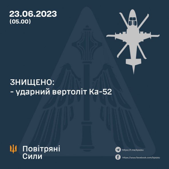 Повітряні сили пізно ввечері 19 червня знищили на Донецькому напрямку ще один російський ударний вертоліт Ка-52. То був п'ятий ліквідований гелікоптер ворога з 16 червня.