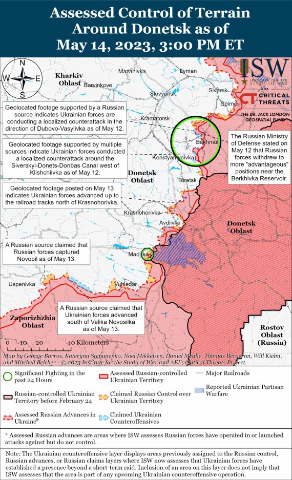 ЗСУ дещо просуваються на східному фронті. 14 травня російські війська не досягли додаткових підтверджених успіхів у Бахмуті та його околицях. Росіяни проводили невдалі наступальні операції в самому Бахмуті; за 9 км на північний захід від Бахмута поблизу Григорівки, Богданівки та Хромового; і в межах 14 км на південний захід від Бахмута поблизу Білої Гори та Предтечиного.