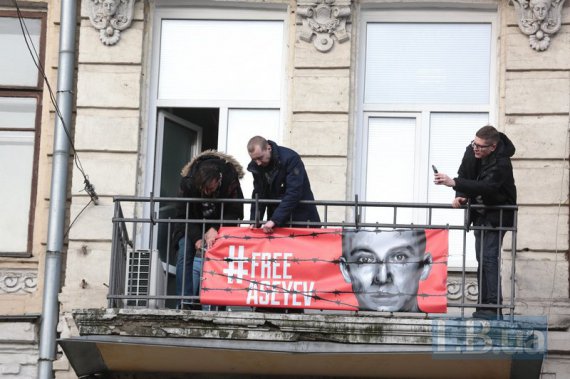 Звільнений з полону терористів журналіст Станіслав Асєєв зняв банер #FreeAseyev з балкона редакції "Українського тижня".