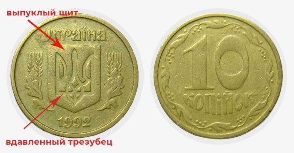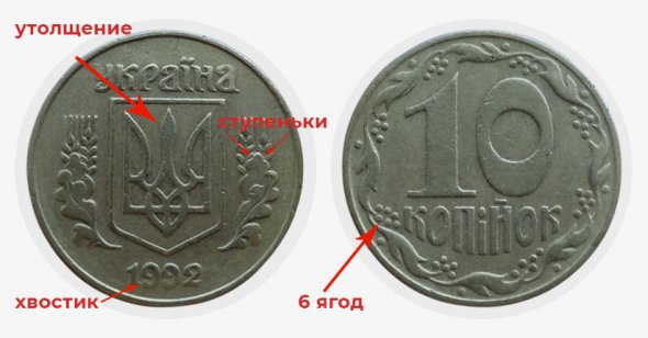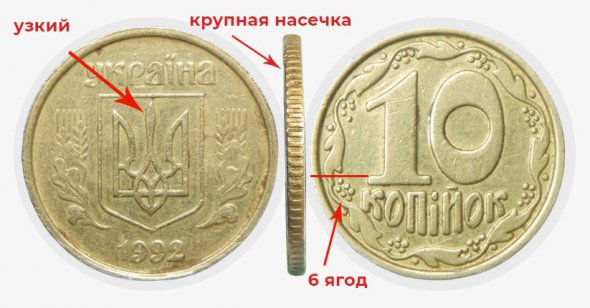 Загалом оформлення монет однакове: на аверсі розміщено тризуб і напис "Україна 1992". На реверсі зазначений номінал "10 копійок". Рідкісні 10 коп. можна відрізнити від звичайних за дрібними деталями: гербом, кількості і розташуванню ягід, гурту, повідомляє профільний портал Monety.