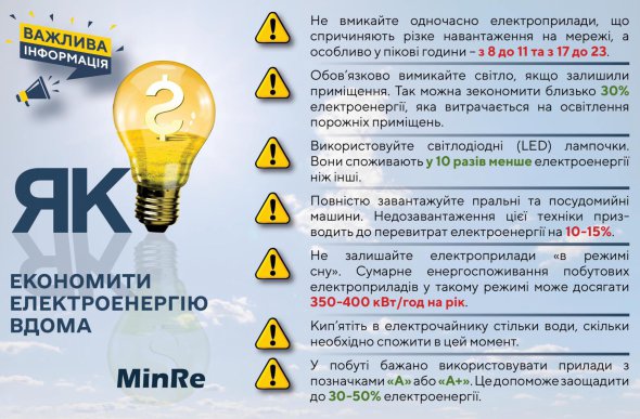 Громадян закликали не вмикати одночасно електроприлади, що спричиняють різке навантаження на мережі, особливо в пікові години – з 8:00 до 11:00 та із 17:00 до 23:00.