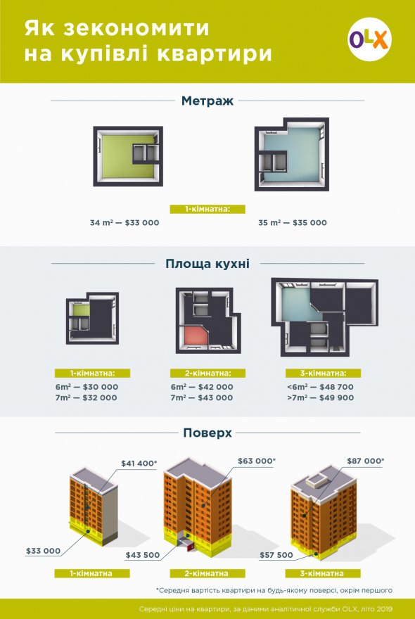 На вартість квартири найвідчутніше впливає метраж, площа кухні та поверх. Так, за "однокімнатку" 35 м² у середньому просять $35 тис. За житло 34 м² - $33 тис.
