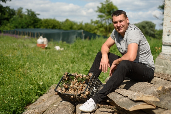"Спершу збирався організувати кролячу ферму. На це потрібно було півмільйона гривень. Якось побачив заморожених равликів у рибному ресторані в Києві. Почав цим цікавитися, вивчати. Попросив друга-далекобійника привезти з Латвії живих равликів. З перших 50 кілограмів за три роки виростив 700. Влітку в раціон равликів входить молода зелень, трава. Підгодовуємо овочами та фруктами в залежності від сезону. Щоб виробити свою технологію, витратив три роки. Зараз продаємо від 50 до 500 кілограмів равликів на місяць. Плануємо розширювати переробку до 1 тони на місяць. Будемо постачати равликів у Євросоюз", - говорить підприємець.