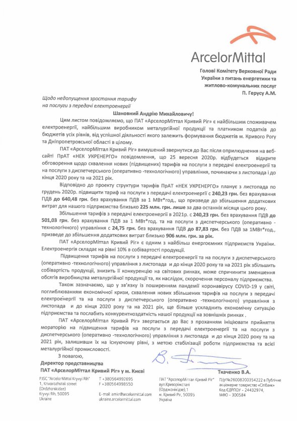 Як стверджується в документі, підвищення тарифу на передачу електроенергії з 1 листопада 2020 року з 240,23 грн. (Без ПДВ) до 640,48 грн. (Без ПДВ) за 1 МВт-год тільки в листопаді-грудні 2020 року призведе до збільшення додаткових витрат "АрселорМіттал Кривий Ріг" в розмірі 225 млн. грн.