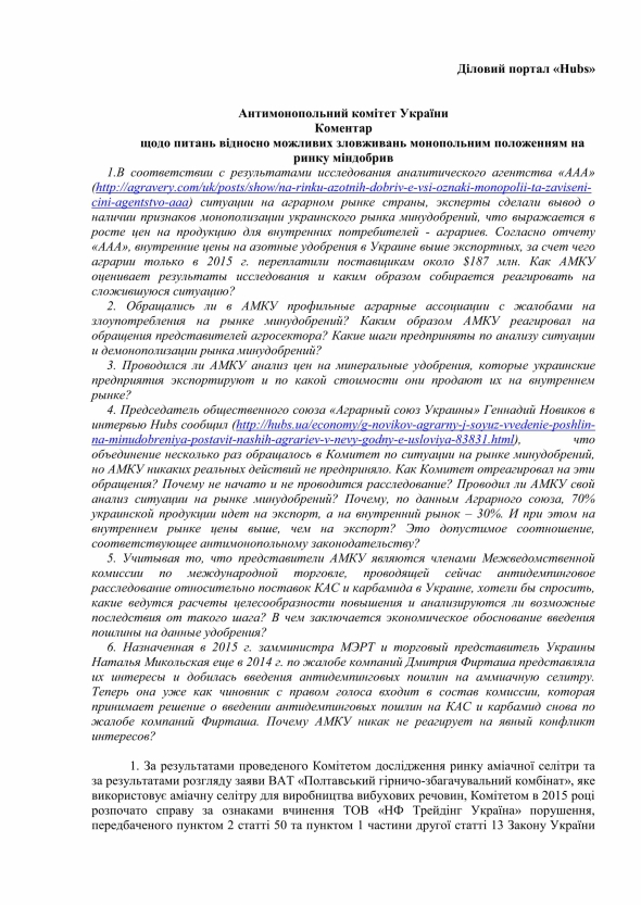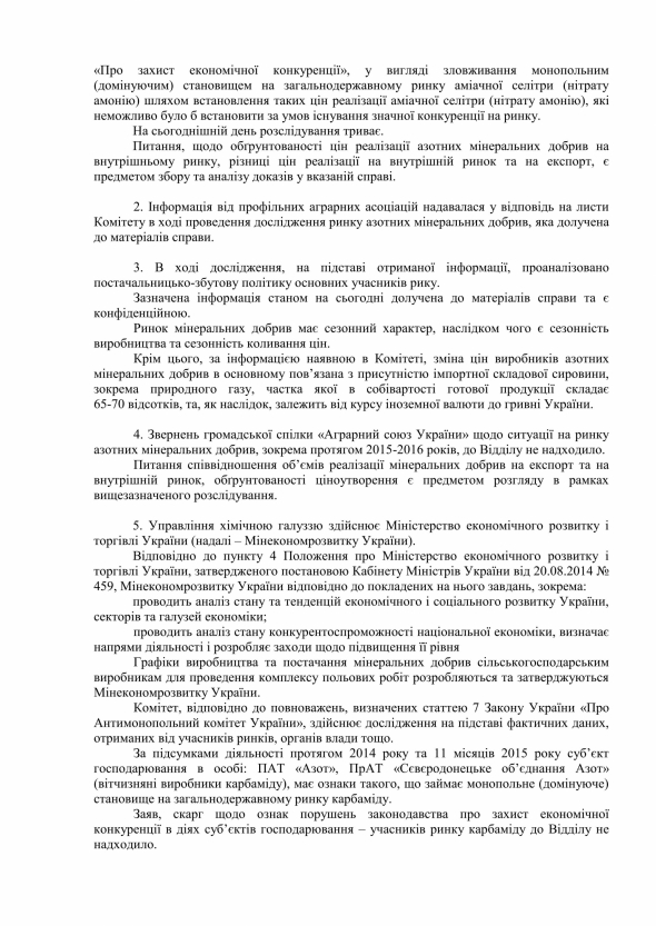 "За результатами проведеного Комітетом дослідження ринку аміачної селітри і за результатами розгляду заяви ВАТ" Полтавський гірничо-збагачувальний комбінат ", яке використовує аміачну селітру для виробництва вибухових речовин, АМКУ в 2015 році розпочато справу за ознаками вчинення ТОВ "НФ Трейдінг Україна" порушення, передбаченого п. 2 ст. 50 і п. 1 ч.2 ст. 13 Закону України "Про захист економічної конкуренції", у вигляді зловживання монопольним (домінуючим) становищем на загальнодержавному ринку аміачної селітри (нітрату амонію) шляхом встановлення таких цін реалізації аміачної селітри (нітрату амонію), які неможливо було б встановити за умов існування значної конкуренції на ринку. На сьогоднішній день розслідування триває. Питання щодо обґрунтованості цін реалізації азотних мінеральних добрив на внутрішньому ринку і різниці цін реалізації на внутрішній ринок і на експорт є предметом збору і аналізу доказів у цій справі", - повідомили у відомстві.