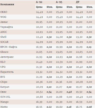 Мережа Shell підняла ціни на 30 коп. Бензин А-95 подорожчав до 24 грн/л, А-92 - до 22,49 грн/л, ДП - до 23,20 грн/л. На станціях UPG, "БРСМ-Нафта" і BVS всі види палива подорожчали на 20 коп.