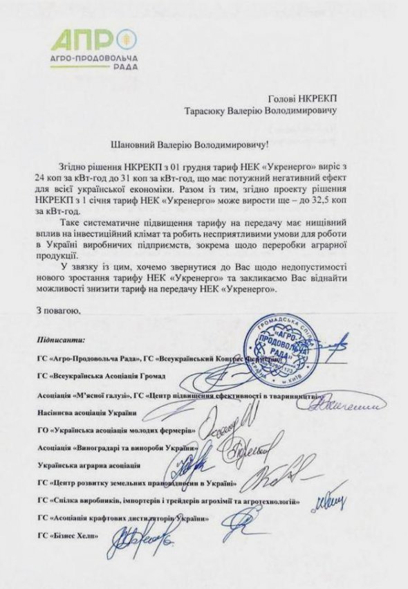 В документі наголошують, що грудневе підвищення тарифів на передачу електроенергії є несприятливим для українських переробних підприємств, зокрема аграрної продукції.