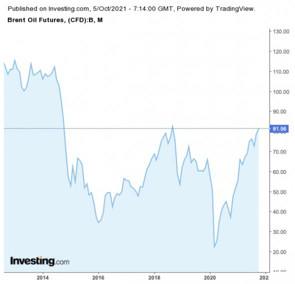 Наприкінці вересня нафта марки Brent становила понад $80 за барель. Провідний еталон сирої нафти зростав шість днів поспіль, досягнувши максимуму від жовтня 2018-го. Нафта цьогоріч зросла в ціні, оскільки розгортання вакцинації у світі сприяє попиту на енергію. Різкий стрибок цін на газ також підживив ціни на нафту. Світ перебуває в умовах нестачі газу та цінових рекордів. Газова криза підсилює попит на нафту, адже тепловиробники починають замінювати газ на нафту та вугілля.